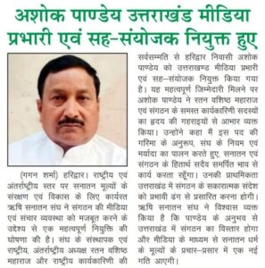 यह महत्वपूर्ण जिम्मेदारी मिलने पर श्री अशोक पाण्डेय ने गुरुदेव पूज्य श्री रतन वशिष्ठ जी महाराज एवं संगठन के समस्त कार्यकारिणी सदस्यों का हृदय की गहराइयों से आभार व्यक्त किया। उन्होंने कहा, “मैं इस पद की गरिमा के अनुरूप, संघ के नियम एवं मर्यादा का पालन करते हुए, सनातन एवं संगठन के हितार्थ सदैव समर्पित भाव से कार्य करता रहूँगा। मेरी प्राथमिकता उत्तराखंड में संगठन के सकारात्मक संदेश को प्रभावी ढंग से प्रसारित करना होगी।”